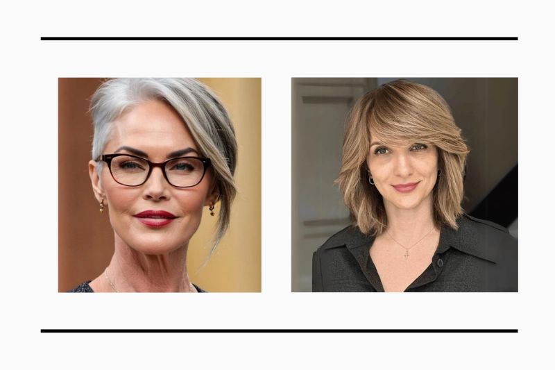 A textured bob with side-swept bangs (ear-length) is ideal. It frames glasses beautifully, adds volume for thinning hair, and requires minimal styling.